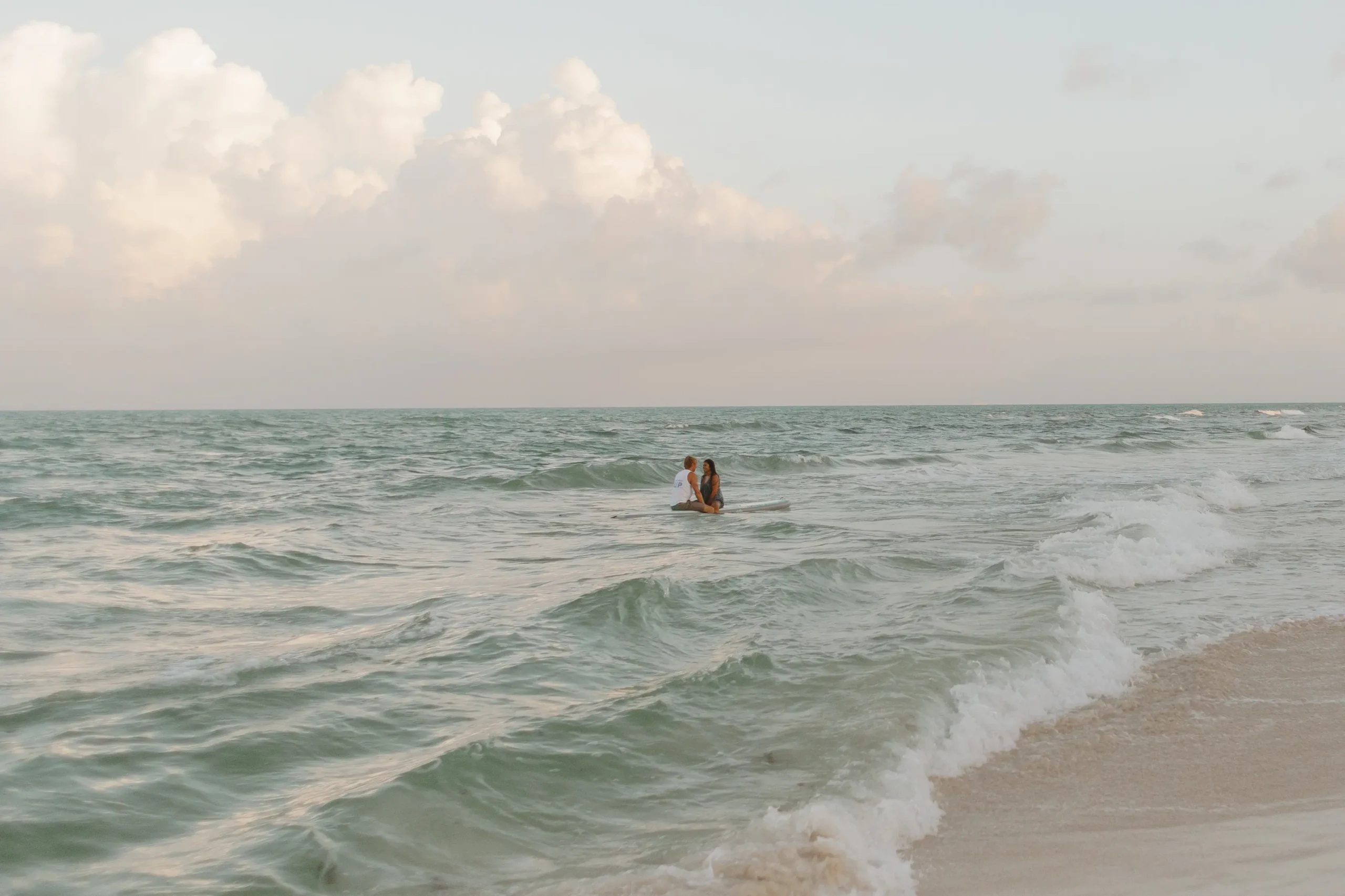 To experience a full-day elopement, consider including activities that span your special day. Maybe have a sunrise elopement, then later enjoy a private, romantic lunch at your Airbnb. For the evening, add a paddleboard activity or a sunset sailboat tour where I can photograph you dancing and jumping together into the water. I actually imagine this perfectly in Bacalar Lagoon—I love this place for these kinds of celebrations.